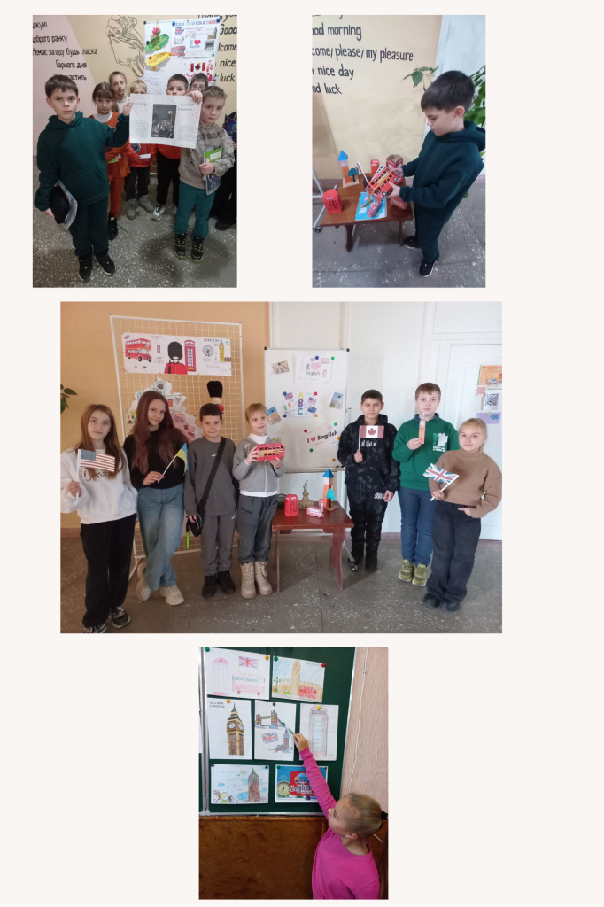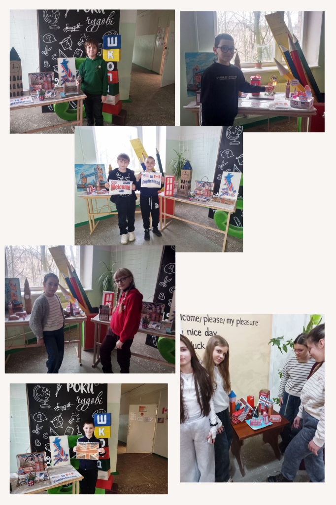 У цей же день учні 7-А, 8-А, 8-Б, 9-А, 9-Б класів продовжили демонструвати свої знання англійської мови, представивши власні відеоролики про англомовні країни. Діти мали змогу висловити своє ставлення до вивчення іноземної мови, використовуючи «Усний журнал». Творчі учасники тижня (учні 4-А, 3-А, 6-А, 6-Б, 4-Б, 8-Б класів) порадували виставкою поробок «Символи англомовних країн».