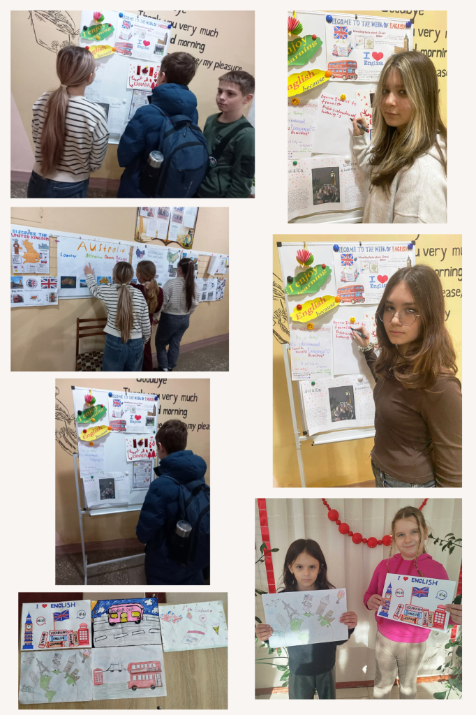 Тиждень розпочався з виставки малюнків і стіннівок «Англомовні країни» (учні 8-А, 7-В, 9-А, 9-Б, 8-Б класів). Їх тематика була досить широкою і різноманітною. Стіннівки давали цікаву інформацію про країни, мова яких вивчається, про їх свята і звичаї. Діти підійшли до виконання завдання сумлінно, творчо та оригінально.