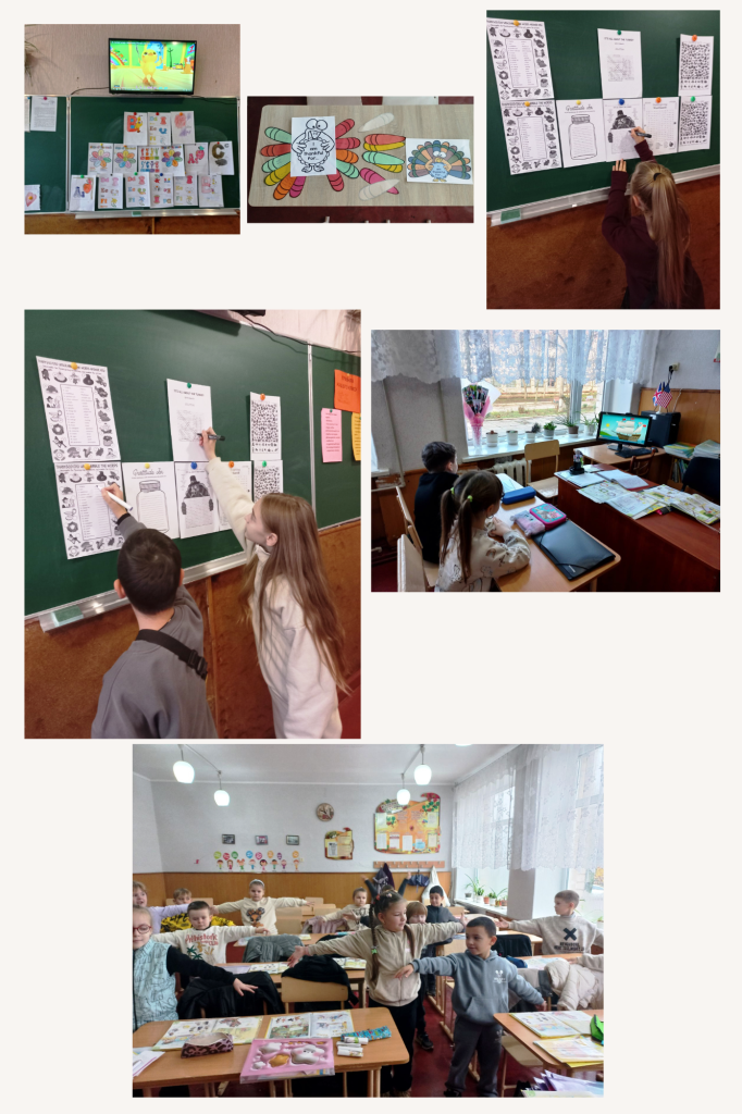 У середу, 26 листопада, вихованці початкової школи захопилися ігровою програмою: проводили веселі перерви, розучували тематичні пісні англійською мовою, переглядали мультфільми про «День подяки» та розфарбовували листівки, повторювали назви кольорів, тренувалися у повторенні структури «I am thankful for…». У 3-В класі діти переглянули захопливі навчальні мультфільми. Учні 5-А класу представляли свої проєктні роботи «Come to the party», а діти з 2-Б – проєкти «My Friends». У 6-Б класі теж відзначили «День подяки» за допомогою цікавих різноманітних вправ.