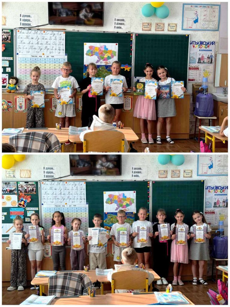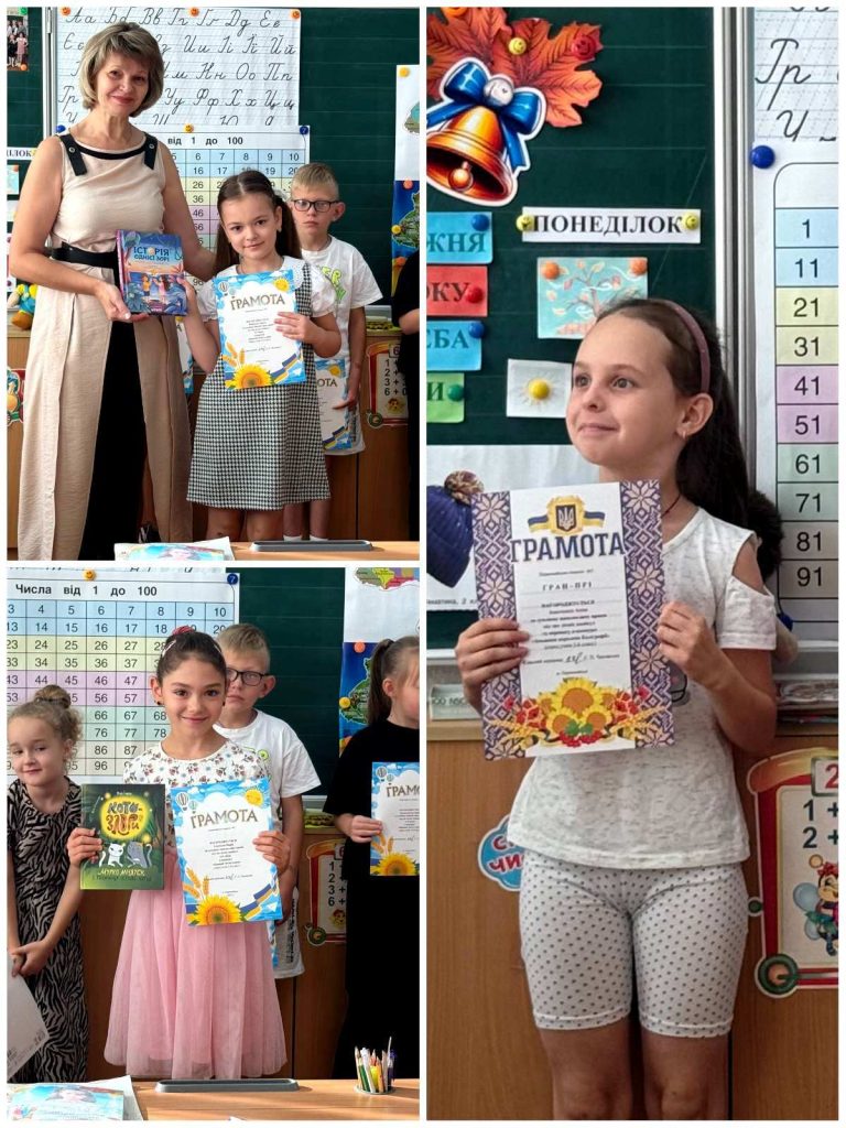 Влітку хлопчики та дівчатка не лише відпочивали, а й виконували завдання королеви Каліграфії та читали улюблені книжечки. За сумлінну працю в мотиваційних щоденниках з’явилися перші заохочувальні відзнаки, а самі наполегливі діти отримали подяки та цінні подарунки. Ось вони – переможці літніх конкурсів: Вовненко Айсель, Ігнатьєва Марія, Іванченко Анна!