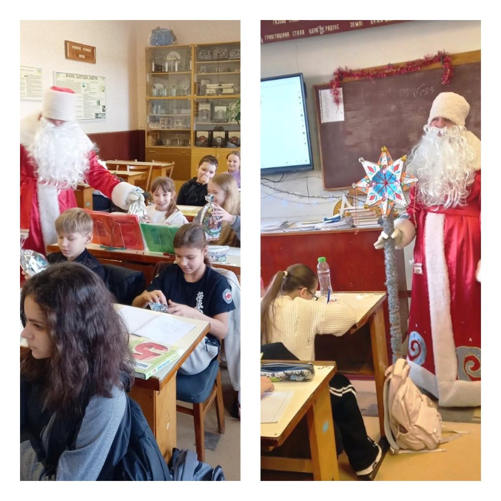 Учні 5-Б класу (класний керівник Флань С.О.) теж не сумували… Напередодні канікул до них завітав Морозенко із солодкими подарунками. Дітям приємно було отримати солодощі саме від казкового героя, адже це так зачаровує, а маленькі сердечка наповнюються радістю і вірою у диво.