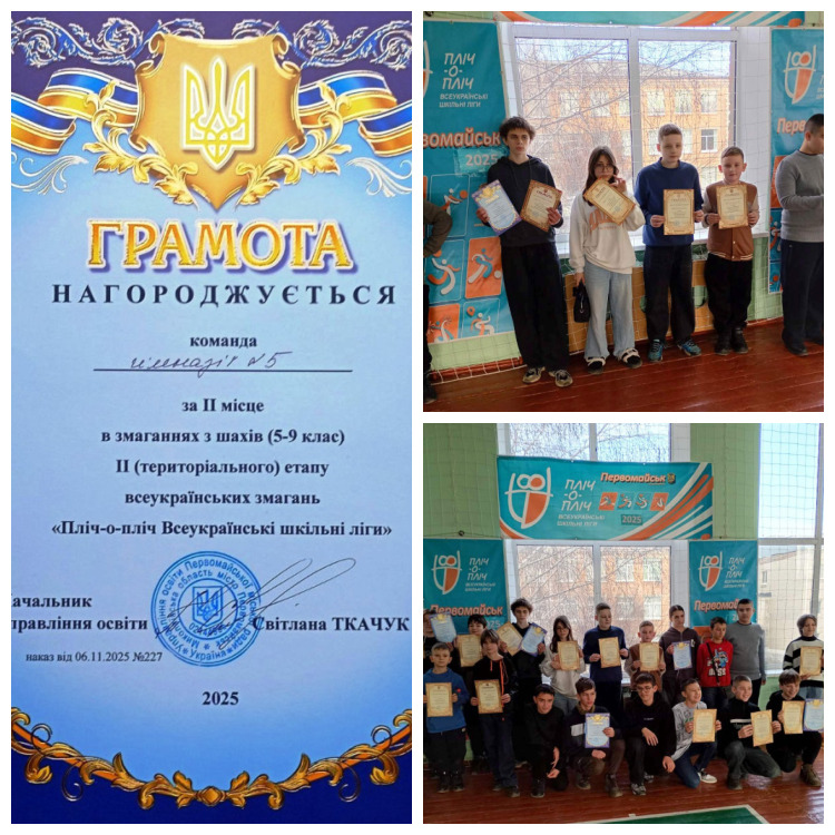 Наші спортсмени теж додали позитиву, адже серед шахістів у змаганнях територіального етапу всеукраїнських змагань «Пліч-о-пліч Всеукраїнські шкільні ліги» вибороли загальне ІІ місце. В особистому заліку гравці мали наступні результати: Музика Данило (5-В) – І місце; Назаренко Назар (9-В) – ІІ місце; Яськевич Наталія (9-В) – ІІ місце; Венгловський Сергій (9-Б) – ІІІ місце! Вітаємо юних шахістів та їх тренерів Ващенка О.В. та Глушка В.В. і бажаємо блискучих партій, вірних рішень та нових перемог!