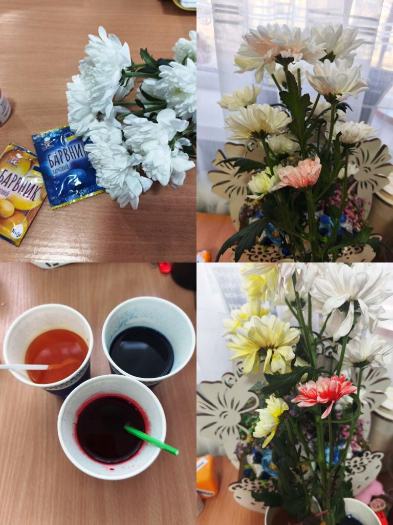 Учні 3-Б класу (вчитель Мещерякова О.І.) на уроках не лише навчаються, а й ще досліджують, експериментують, спостерігають. Так, на минулому тижні досліджували живлення рослин. А саме виконали проєкт, під час якого за допомогою забарвленої води змінювали колір квітки. «Крилатики» з нетерпінням спостерігали, як білі квіти хризантеми, поступово змінювали свій колір.