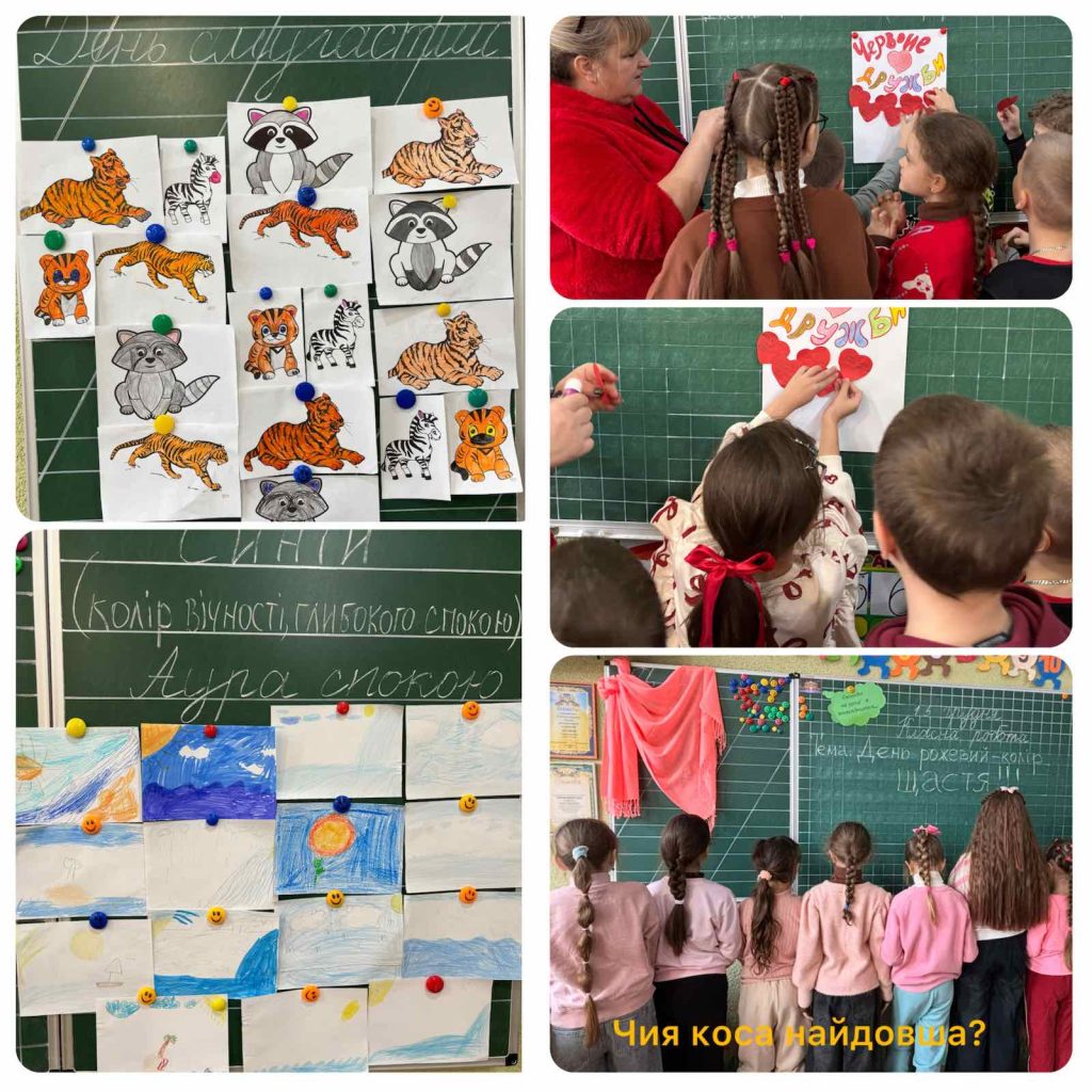 Для учнів 2-А класу (класний керівник Телегера Н.М., асистент вчителя Куц А.І.) минулий тиждень приніс багато позитивних емоцій… Кольоровий тиждень відбувся на високому емоційному підйомі. І не тільки тому, що треба було одягнутися та дібрати аксесуари певного кольору… Діти вчилися підбирати асоціації до кольорів, виконували різноманітні інтерактивні вправи, наприклад: день смугастий подарував деякі факти й спогади про тварин, які теж мають смужки. В день синього кольору діти створювали «ауру спокою» через малюнки, адже колір асоціювався з глибоким спокоєм, рівновагою, вічністю і таємницею. Хлопці, чомусь, визначили рожевий колір як дівочий. Тому цей день присвятили дівчаткам: вибирали чия ж коса найдовша? Виявилося, що – Аліси Пасічник! У «червоний» день говорили про єдність, енергію, любов та намалювали плакат «Червоне серце дружби», де другокласники презентували свого друга і його позитивні риси характеру.