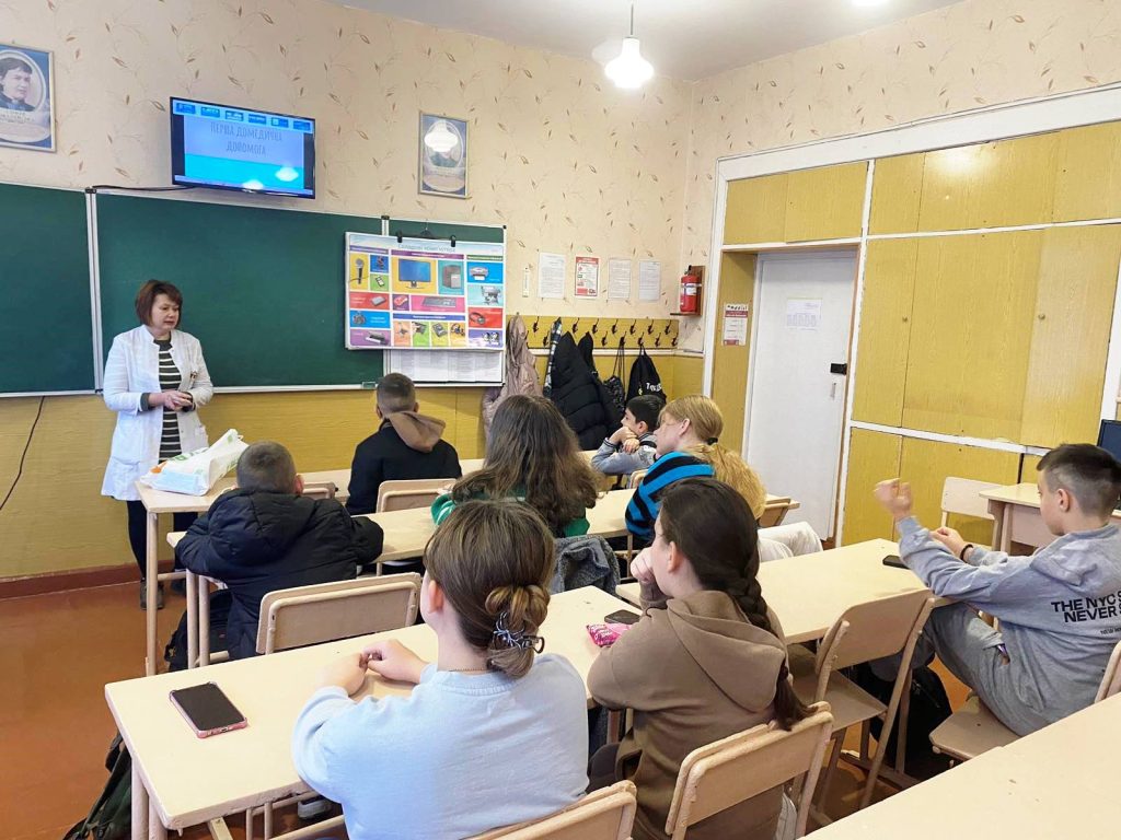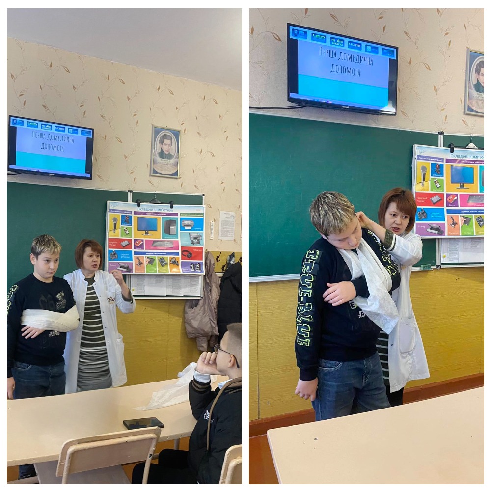 А до учнів 6-В класу (класний керівник Богульська Є.В.) завітала медична сестра гімназії Мезенцева О.В.. На шестикласників чекав практикум з надання домедичної допомоги. Оксана Олександрівна розповіла та показала на практиці, якими мають бути дії учнів під час небезпечної ситуації у разі кровотечі, переломів, опіків. Медична сестра також звернула увагу школярів на безпечну поведінку біля водойм взимку, провела бесіду щодо дотримання правил обережного поводження на льоду, аби не трапилося лиха. Гімназисти слухали уважно, тож сподіваємося, що вони будуть завжди обачними і впевненими у своїх діях…