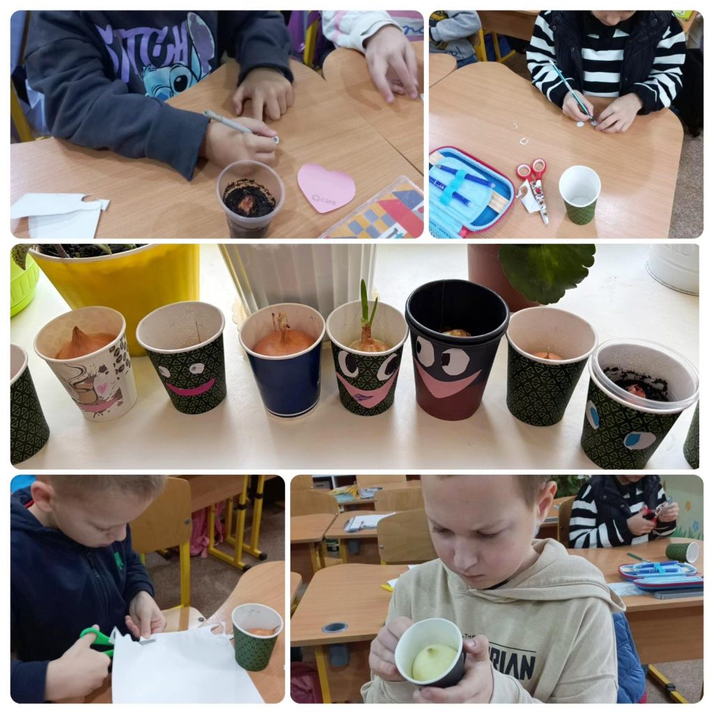 На початку тижня діти 2-А почали досліджувати умови росту рослин в класі: «оживили» паперові стаканчики і висадили «Цибулино». Другокласники не тільки дослідять терміни появи зелені, а ще й на сніданки братимуть до каш вітаміни, «викохані» своїми руками.